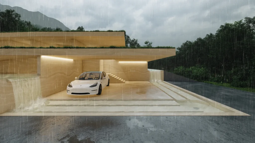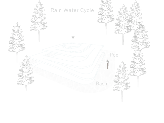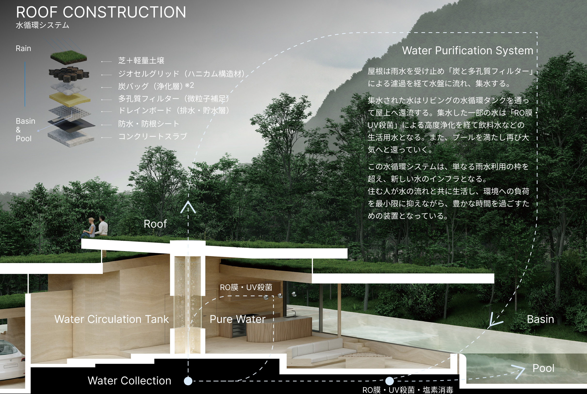 屋根という『山』で雨を受け止め、土壌という『森』の大地で濾過し、プールという『海』へ流れる。
